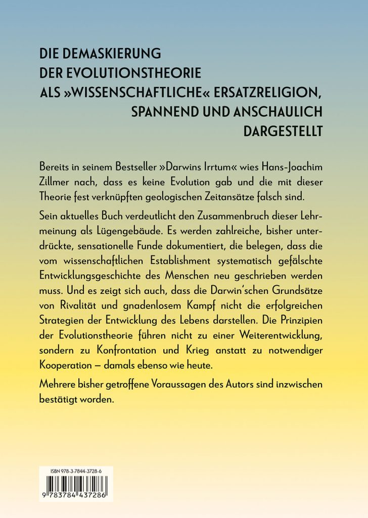 In diesem Buch werden zahlreiche, bisher unterdrückte sensationelle Funde dokumentiert, die belegen, dass die vom wissenschaftlichen Establishment systematisch gefälschte Entwicklungsgeschichte des Menschen neu geschrieben werden muss. Aber es zeigt sich auch, dass die Propagierung der Darwinschen Grundsätze von Rivalität und gnadenlosem Kampf nicht die erfolgreichen Strategien der Entwicklung des Lebens darstellen. Durch den vom Darwinismus begründeten Rassismus wurde die Grundlage von Ideologien gebildet, die die Welt im 20. Jahrhundert in ihre bisher blutigsten Konflikte stürzen sollte: Nazismus und Kommunismus. Bildet der Darwinismus heutzutage auch die Ursache für den Terrorismus? Die Prinzipien der Evolutionstheorie sind falsch, wie Zillmer zeigt, denn diese führen nicht zu einer Weiterentwicklung, sondern zu Konfrontation und Krieg anstatt zu notwendiger Kooperation – zu Zeiten unserer Vorfahren ebenso, wie auch heutzutage und in der Zukunft.